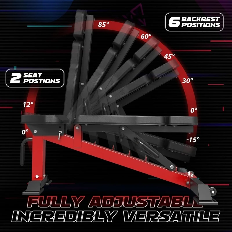 Adjustable Design: With a 6-position adjustment, this workout bench is capable of supporting 85°, 60°, 45°, 30°, 0°, and -15° angles, giving you the flexibility to perform a variety of exercises. Whether you're looking to perform a bench press, incline bench, or any other strength training exercise, this bench has got you covered.